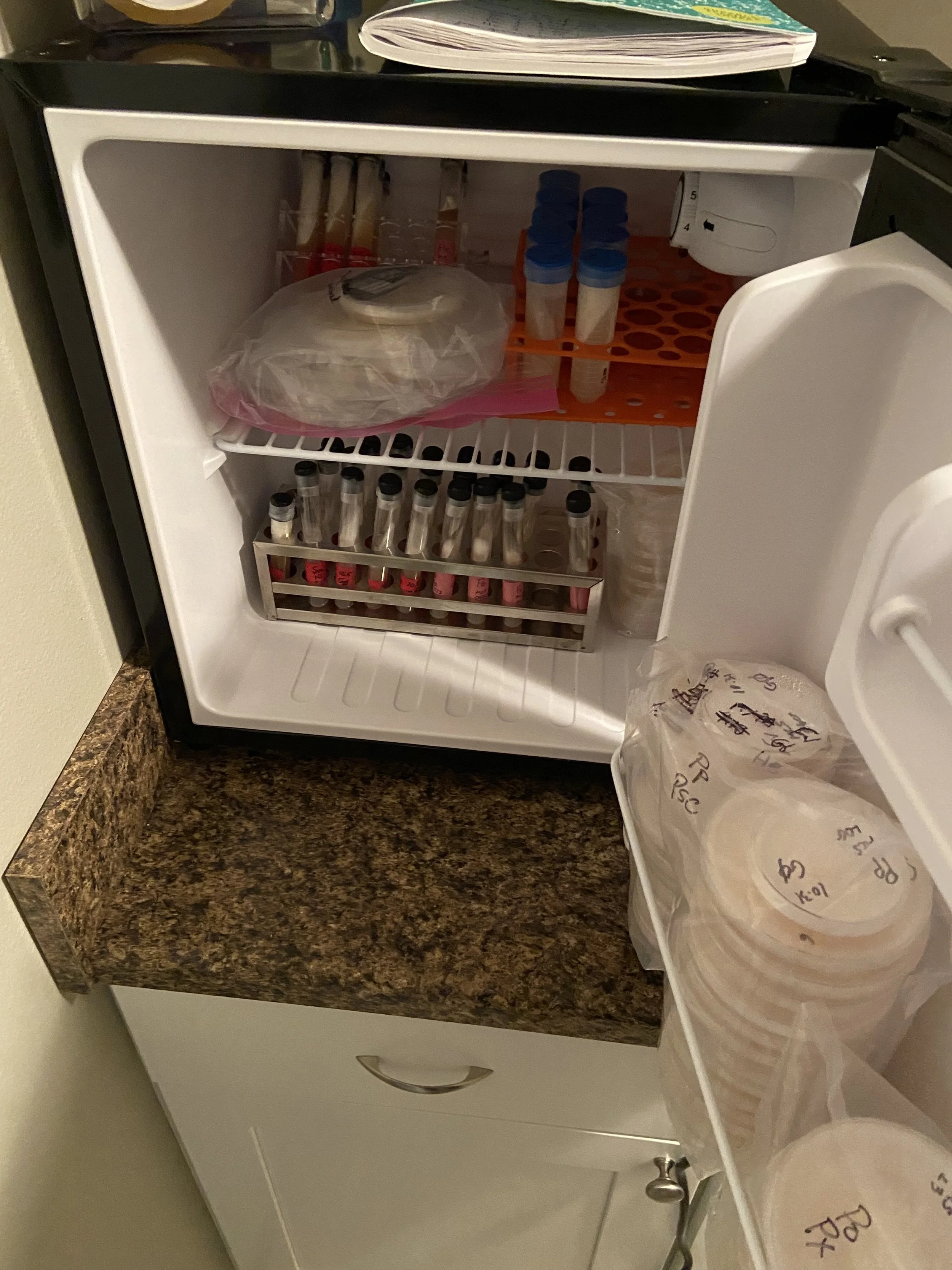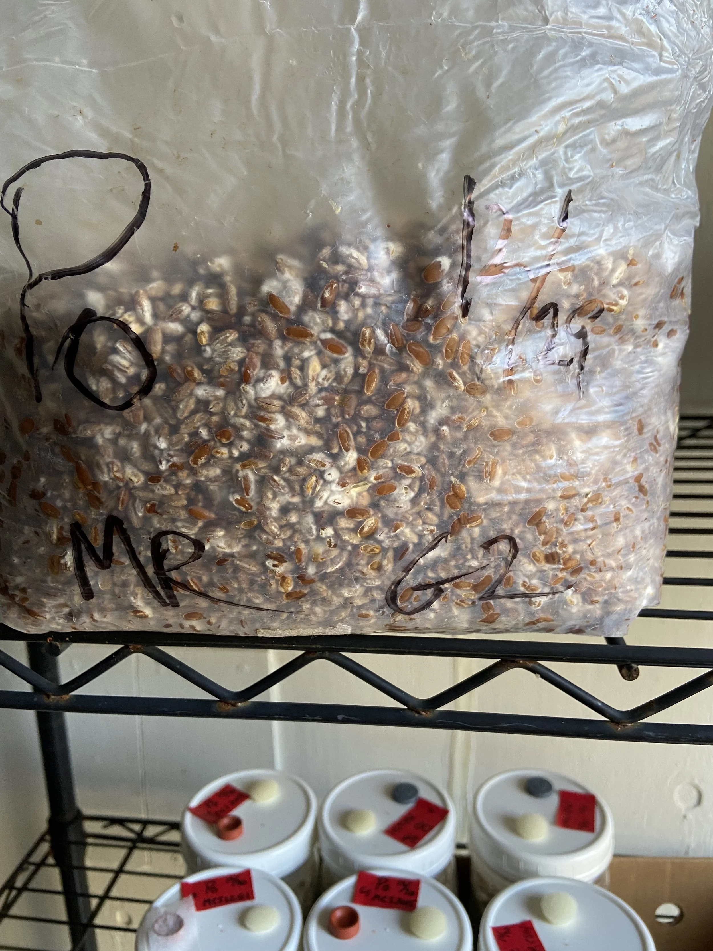 Mushroom farming begins at the lab with tissue culture, liquid culture, grain sterilization and spawn creation. Each variety’s genetics is purchased from other farms or companies that specialize in mushroom culture. The fresh culture is expanded into 10-12 slants that we use to always have the youngest and freshest culture possible in our spawn production each month. Each month a new slant is taken out of the fridge and the mycelium is put onto a petri dish to grow, and once expanded it will be used to create grain master jars or liquid culture, depending on what species we are using. After the grain master or liquid culture has colonized we sterilize 3-5 lbs of rye grain or rolled oats and once cooled the two are mixed to create spawn for bulk substrate inoculation. Contrary to the general belief that mushroom farms have to be super clean, the lab portion of farming, and inoculation are the times that need the most care in regards to cleanliness as one single mold spore, or single bacteria can ruin thousands of dollars of bulk substrate down the line.