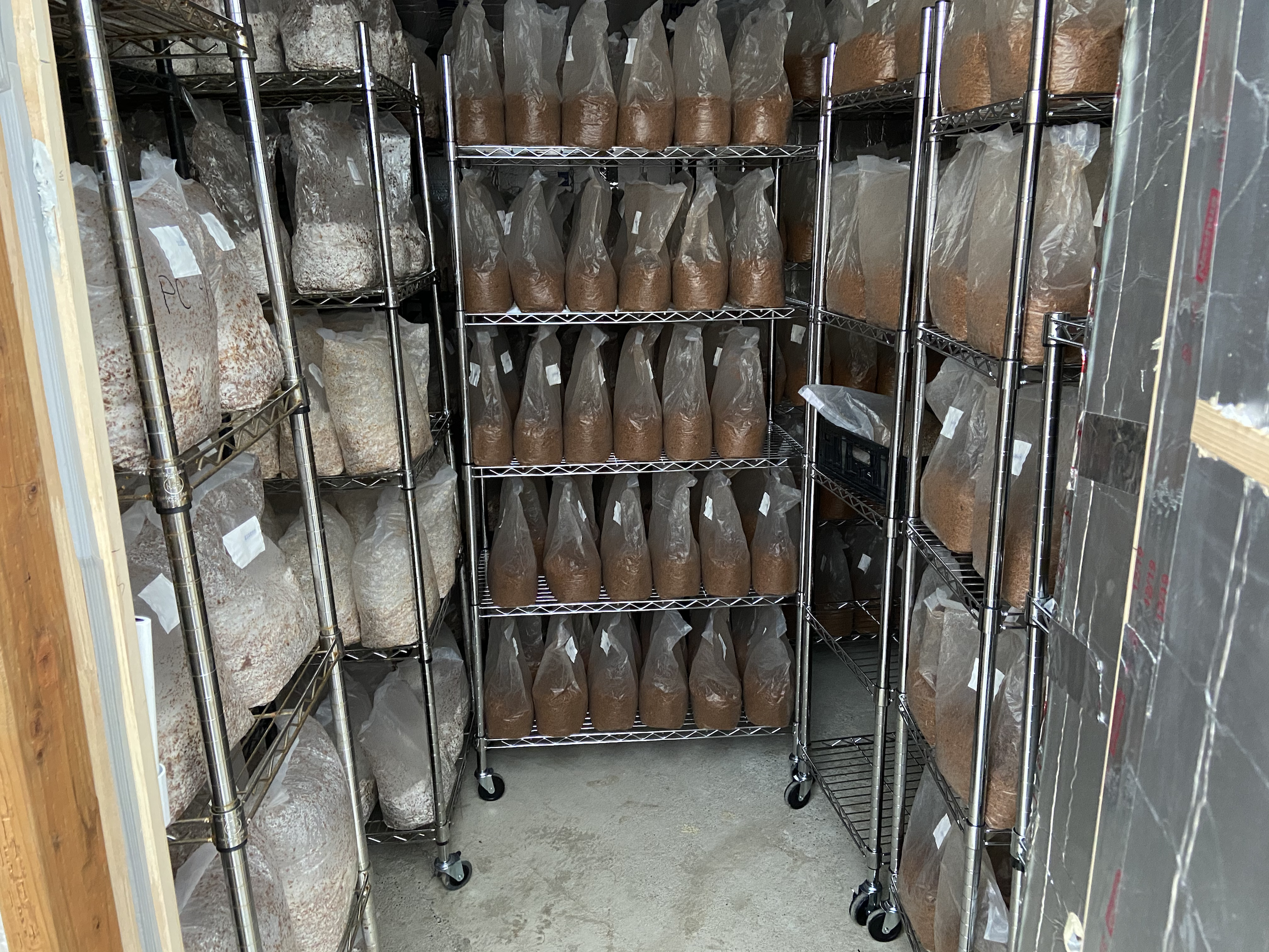 Once pasteurized and then cooled to 90 degrees F, we inoculate each bag with spawn. After each bag is inoculated they are individually sealed with an impulse sealer and stacked on a rack and rolled into an incubation room and left of so the mycelium can colonize the substrate. Incubation takes place from 10 days to 100 days depending on the variety grown and the incubation environment is kept at a consistent 70 degrees F and as little light as possible to prevent premature pinning in the bags. The ideal temperature of incubating mycelium is 80-82 degrees but it is imperative the incubation room be kept at 70 degrees. Mushroom are thermogenic and can kill themselves by overheating. The internal temperature of the colonizing bags are usually 8-12 degrees warmer than the room temperature. And any internal temperatures above 85 degrees will result in bacteria blooms that spoil production blocks, or slow the growth and reduce the yield of production blocks. Our nose is our best tool for determining this contamination as many types of contamination generate particular smells that are very recognizable.