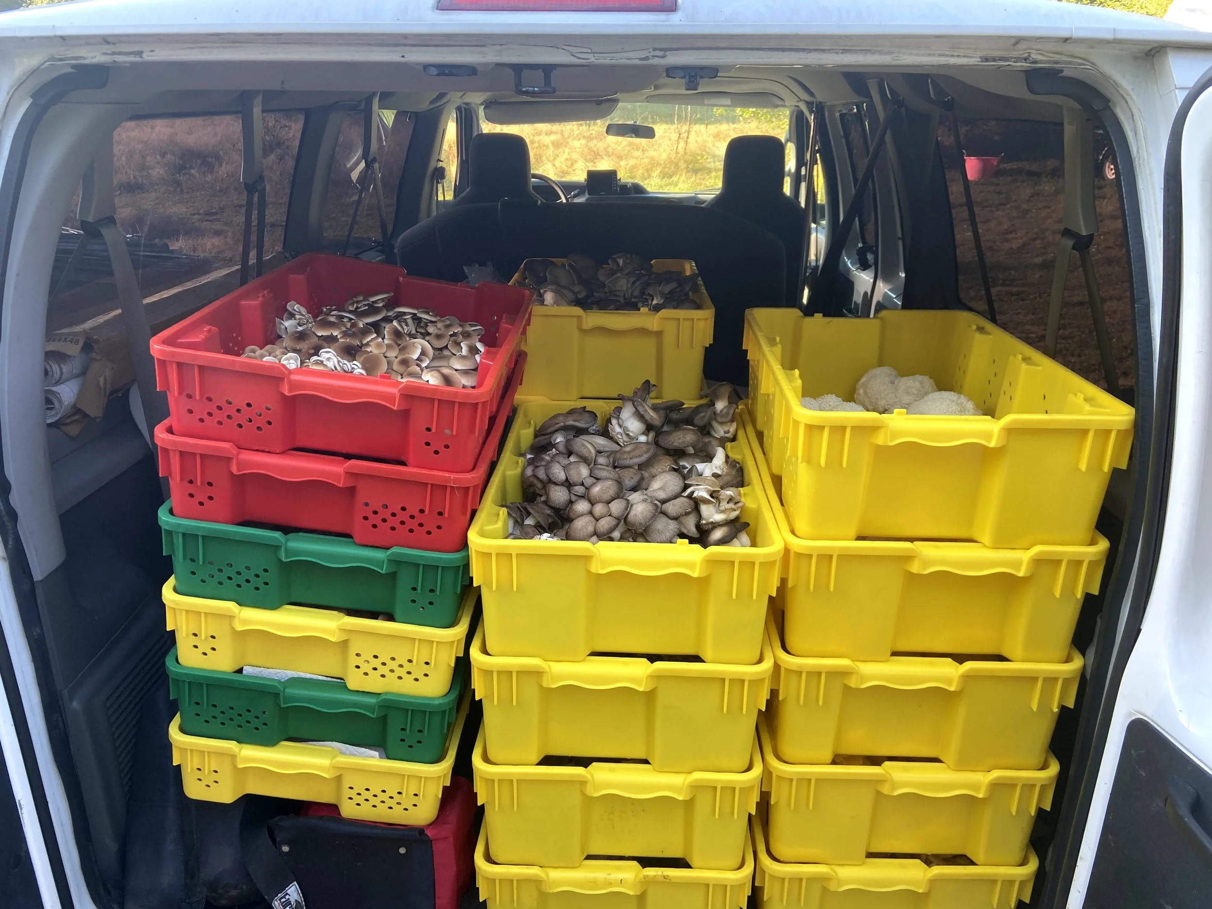 Fruiting the mushroom blocks is the final stage of production. Mushroom formation, for our varieties, requires stable temperatures around 60 degrees F and a humidity around 90%. Mycelium produces CO2 when colonizing substrate and when producing mushrooms, so the grow environment needs a consistent supply of fresh air to grow properly as high CO2 will produce malformed mushrooms for most varieties. Maintaining atmospheric CO2 levels, while maintaining 60 degrees and 90% humidity can be challenging when you have a room full of thousands of blocks producing CO2! All three major environmental conditions are monitored and controlled with sensor equipment. Constant monitoring and years of experience means we can usually catch a growing problem early before it affects the mushrooms. Any one of these environmental variables out of balance can lead to major production issues. Each variety stays in the grow room for different lengths of time, usually from 2 - 5 weeks. Some varieties need to be “shocked” into production, at our farm we roll them into the walk-in cooler overnight and then they go into the grow room. Harvesting is simple, just grasp the base of the mushroom or mushroom clump and twist or bend it 90 degrees. It will break off with some substrate attached, and leaving the substrate on will increase the shelf life of the mushrooms. Harvested mushrooms are immediately refrigerated to ensure the longest shelf life.